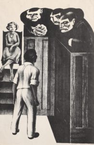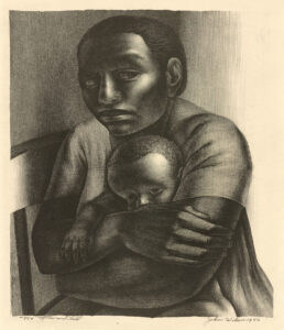Waarom raakt deze litho mij zo diep? John Wilson maakte dit werk (Negro Woman) in 1952. Het beeld van de vrouw blijft op mijn netvlies hangen. Ik zie een gezicht en houding die geestkracht en intensiteit uitstralen. Tegelijk herken ik ook een sfeer van beklemming en spanning: ze staat onder druk. Het is geen blijhartige, maar gekwetste kracht en ze blijft op haar qui-vive.